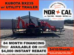 Take on digging, hauling, and property maintenance with the Kubota BX23S sub-compact tractor package, a powerful all-in-one solution for homeowners, small acreage owners, landscapers, and light construction work. This turnkey package includes the BX23S tractor, front loader, backhoe, and a tandem axle utility trailer, making it easy to tackle jobs on-site and transport your equipment with confidence.